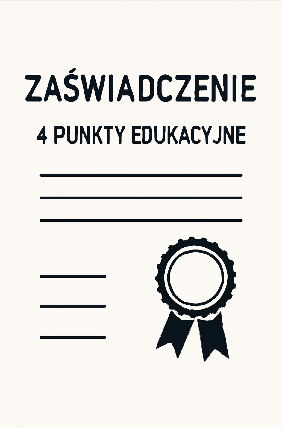Szkolenie kończy się otrzymaniem zaświadczenia z hologramem (wersja drukowana) + wpis do karty rozwoju zawodowego potwierdzającego zdobycie 4 punktów edukacyjnych.