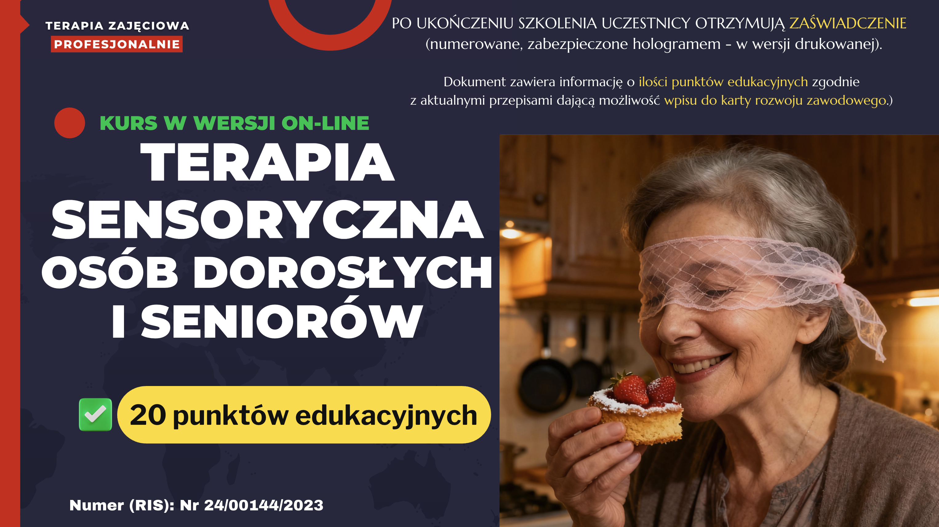 W ramach kursu omówione zostaną kluczowe obszary terapii: terapia smaku i węchu, wspierająca apetyt, pamięć i emocje; terapia słuchu i wzroku, ukierunkowana na poprawę koncentracji, orientacji przestrzennej i komunikacji; terapia propriocepcji i równowagi, rozwijająca świadomość ciała, stabilność postawy oraz koordynację ruchową. Szczególną część programu stanowi moduł „Sala Doświadczeń Świata dla osób dorosłych”, w którym uczestnicy poznają zasady tworzenia i prowadzenia sesji terapeutycznych w salach polisensorycznych (Snoezelen).